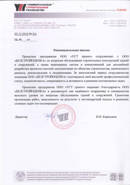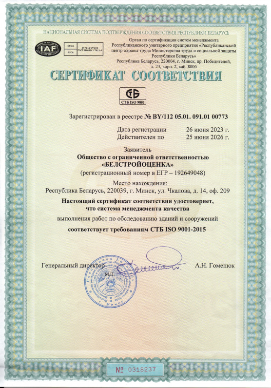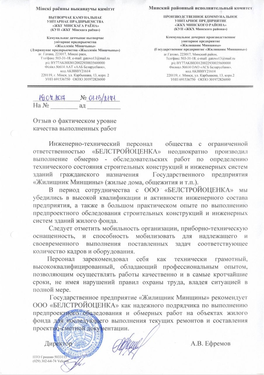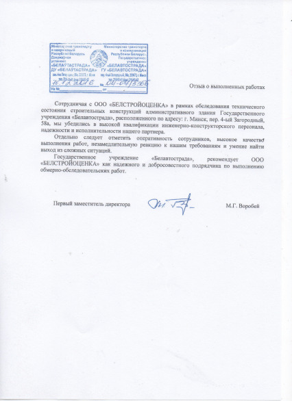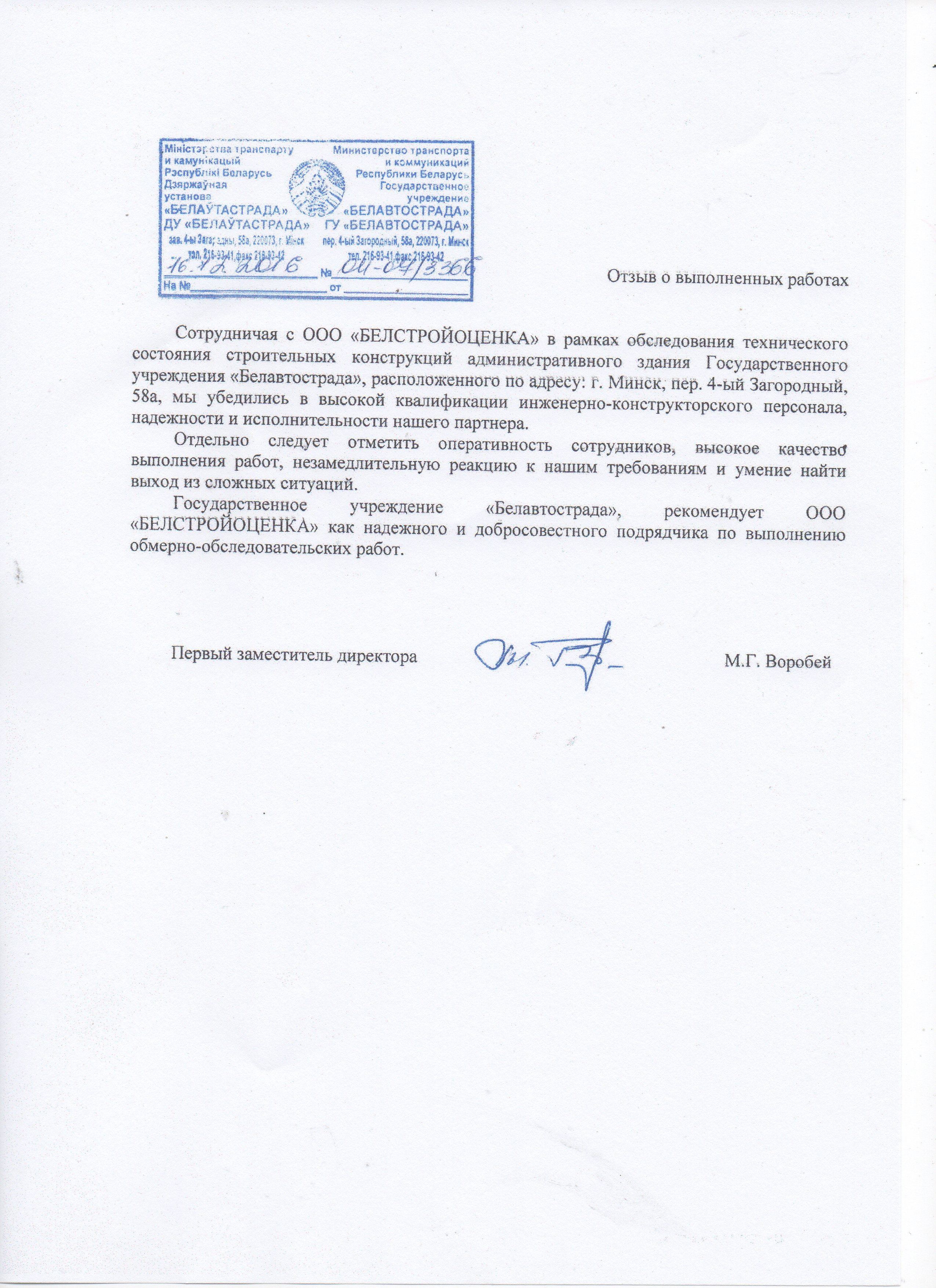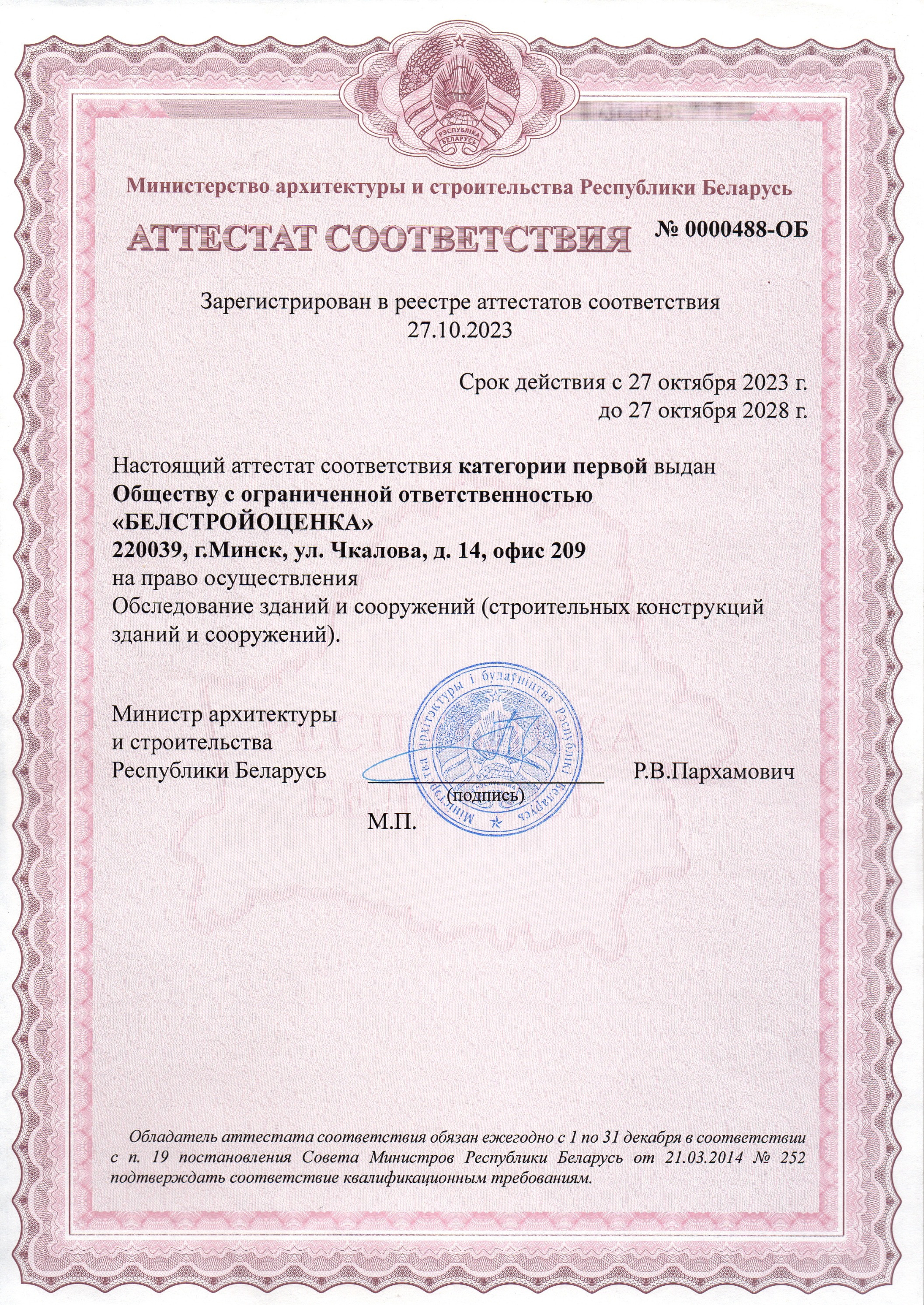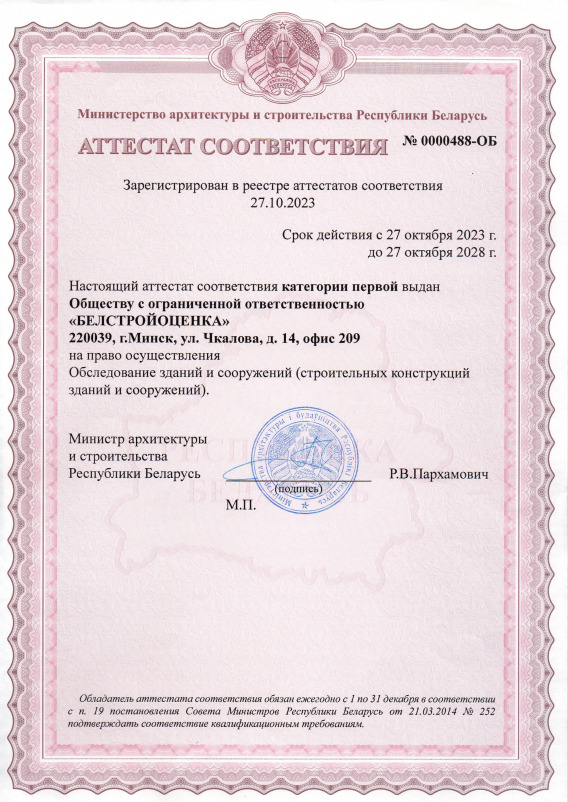 ООО "БЕЛСТРОЙОЦЕНКА" осуществляет деятельность в области обследования технического состояния зданий и сооружений промышленного и гражданского назначения различной степени сложности по всей территории РБ. Наша организация имеет соответствующие разрешающие документы на проведение данных видов работ.